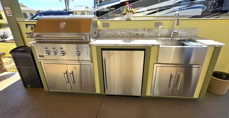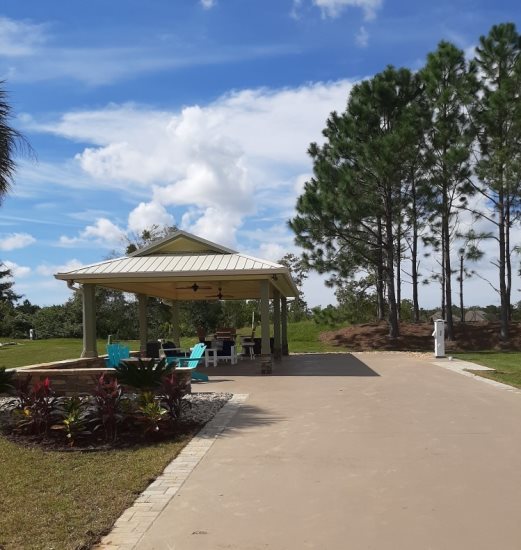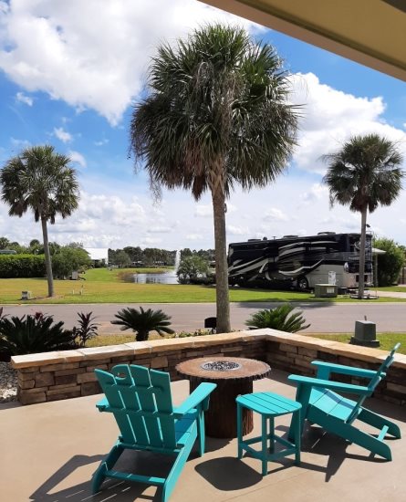 Enjoy the ultimate outdoor living experience on this beautifully appointed RV site, designed for both comfort and convenience. The spacious covered patio features a fully equipped outdoor kitchen with elegant granite countertops, a natural gas grill, built-in refrigerator, sink with hot water, and a dedicated food prep area—perfect for entertaining or relaxing meals at home. Two ceiling fans and recessed lighting ensure a comfortable atmosphere day or night.