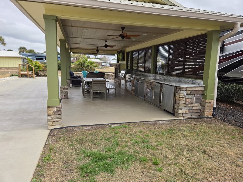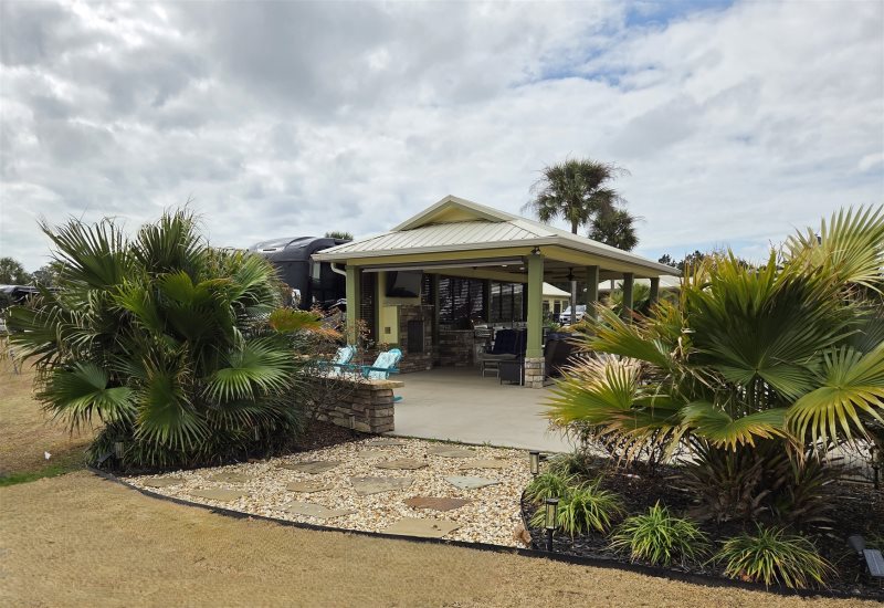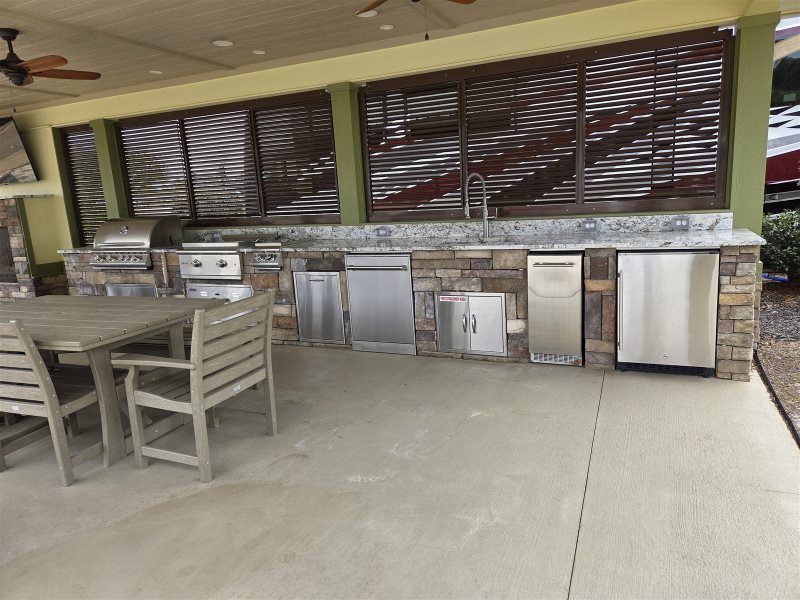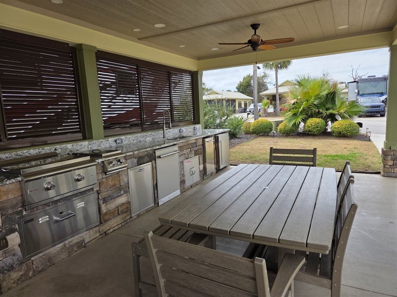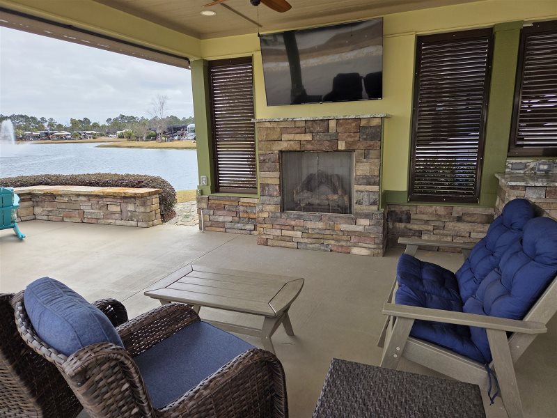 Better to experience this beautiful lot in person than to hear about it a hundred times! 537 Portofino Loop awaits your arrival with luxury amenities! Stepping out of your coach you’ll be met by a natural gas fireplace that will create the quiet ambiance you’re looking for. After a long drive, take comfort seated on the luxury Adirondack bench and take in the sounds of our cascading water fountain. In the evening the lighting of the fireplace coupled with the illuminated fountain lights and a favorite beverage will surely be relaxing. A custom stone walkway from the edge of the patio allows for easy steps into the lush grass on the Southwest side. This extended patio boasts all the kitchen essentials needed to enjoy the great outdoors. Guests are welcome to use the natural gas grill and griddle for dinnertime BBQ and breakfast cakes! Additional seating for meal settings includes four chairs and a bench nestled around a spacious table. Other handy kitchen appliances include a natural gas stove top burner, warming drawer, a sink, mini-fridge, and a dual pull-out trash receptacle. Come see how we live and book your stay today! Please note, the dishwasher, lakeside shade, television and ice maker on this lot are not part of the rental, these appliances are for owner use only.