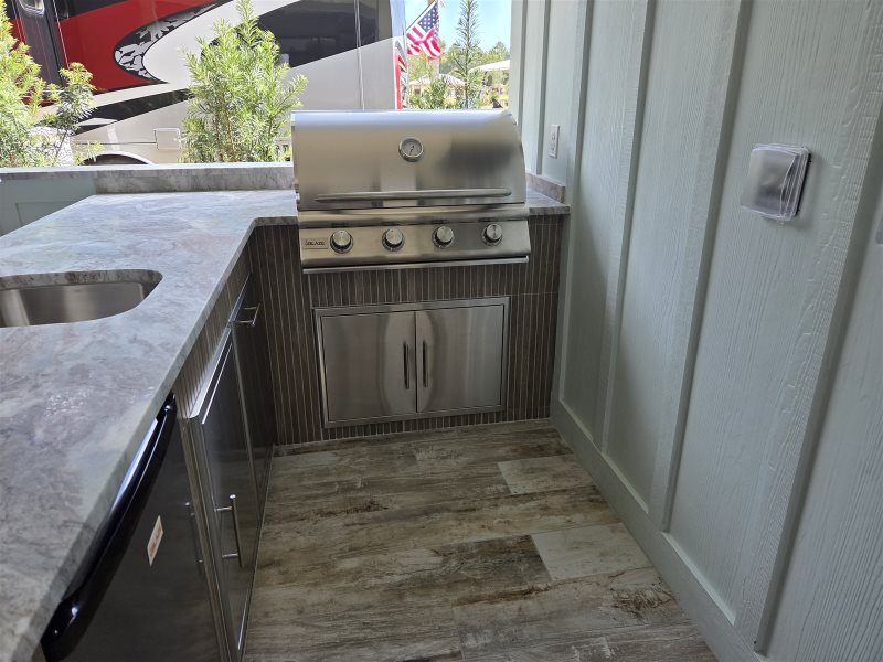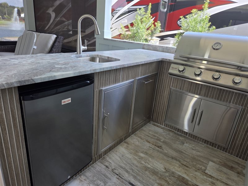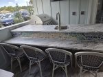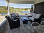 The covered patio features a fully appointed outdoor kitchen with two-tiered granite countertops, a built-in natural gas grill, sink, refrigerator, and discreet trash receptacle—ideal for effortless entertaining. Enjoy seating for four at the bar-style counter—ideal for dining, socializing, or watching your favorite chef at work. A mounted TV with remote completes this inviting indoor/outdoor living area, making it the perfect blend of comfort, function, and lakeside elegance. Unwind in the comfortable lounge area, complete with luxurious swivel rockers, a plush loveseat with deep, cushioned seating and one of two, natural gas firepits—perfect for cozy evenings by the lake. Above, an oversized 12-blade ceiling fan with remote keeps the area cool and comfortable year-round, while three electric, tinted blinds, with remote control, offer shade and privacy at the touch of a button.