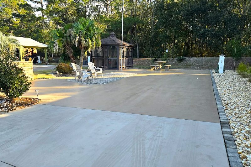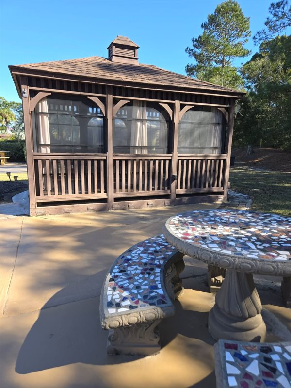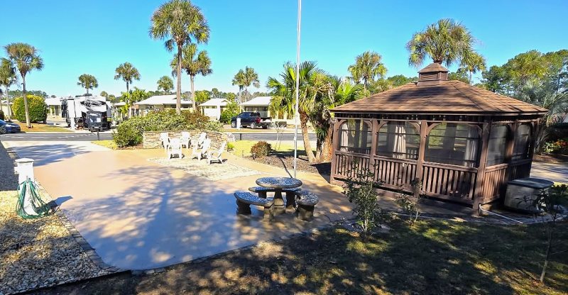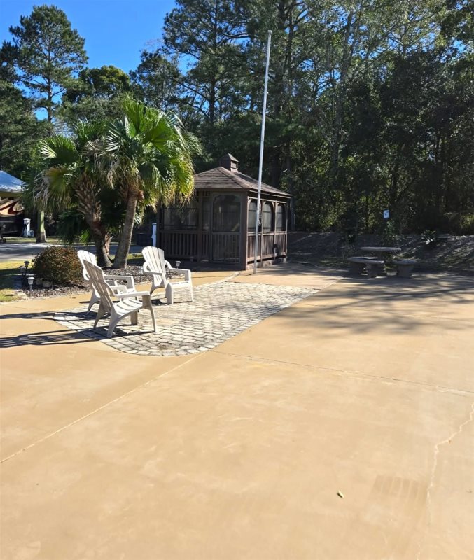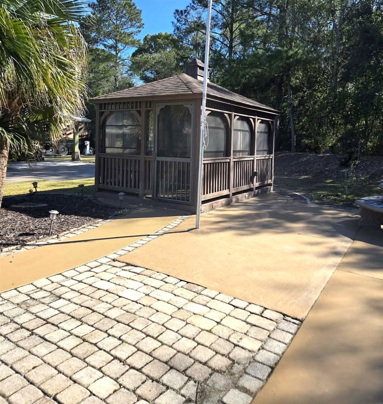 Nestled on the resort's coveted South (back) terrace, this spacious site offers comfort and privacy. Surrounded by lush landscaping, this oversized lot features a 10' x 14' screened gazebo for outdoor enjoyment. The gazebo is raised and features interior plank flooring and Vinyl Tech windows. Inside the gazebo, relax with friends on the wicker cushioned conversation set. There is a ceiling fan and drapes that can be drawn for extra shade or privacy. The extended patio area features a cement table and benches for outdoor dining. There is an outdoor deck box for your storage needs. Other amenities include decorative patio pavers, a stacked stone privacy wall and lush irrigated landscaping. Parcel is a fee-simple deeded property offering 4,499 sq ft.