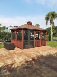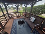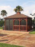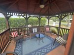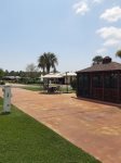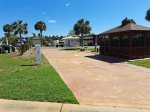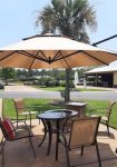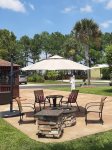 Welcome to 577 Portofino Loop, a superior pull through lot with an extra large patio, multiple seating options, and a screened in gazebo with comfortable furnishing and ceiling fan! Enjoy an evening outside the gazebo with a bistro table and chairs nestled around a beautiful gas firepit. A granite tabletop base houses the propane tank and can be used for your favorite beverage to rest on! During the daytime, the large umbrella offers extra shade to keep you outdoors longer. This is the ideal lot for those who want to be a close walk to our Welcome Center, grand Clubhouse, and our beautiful infinity edge swimming pool. Propane for the firepit sold separately at our Welcome Center, please inquire with our staff for current price.